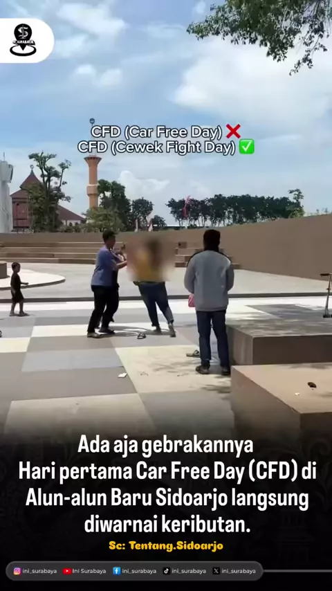 Ada aja gebrakannya ЁЯШ│ Hari pertama Car Free Day (CFD) di Alun-alun Baru Sidoarjo langsung diwarnai keributan. Diduga rebutan lahan jualan, dua perempuan terlibat adu jotos di tengah keramaian warga yang sedang menikmati CFD perdana. Suasana yang harusnya santai mendadak tegang dan bikin pengunjung kaget. Beruntung, warga sekitar sigap melerai dan menenangkan keduanya. Situasi pun kembali kondusif, CFD tetap berlanjut seperti biasa. CFD seharusnya jadi ruang sehat, aman, dan nyaman untuk semu...