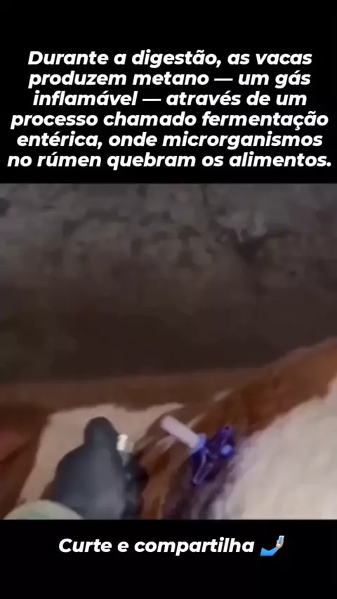 Quando a vaca fica inchada de gases, esse metano se acumula no estômago, gerando uma pressão que pode colocar a vida do animal em risco. Nestes casos, um veterinário insere um tubo para aliviar o excesso de gás. Se esse metano entrar em contato com uma chama.... Ele pega fogo na hora! #Metano #ciência #conhecimento