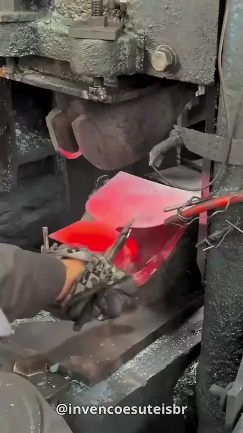 Metal incandescente virando ferramenta em segundos 🔥⚙️ Sai da prensa ainda vermelho… e já começa a ganhar forma na hora. Força, precisão e temperatura no ponto certo! Processo bruto, resultado perfeito 👌 #invençõesúteis #metalurgia #forja #indústria #engenharia