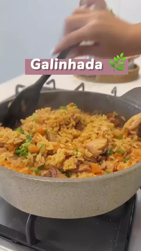 Receita: 3 sobrecoxas desossadas ½ cebola picada 3 dentes de alho Bacon (a gosto) 1 xícara de cenoura picadinha 2 xícaras de arroz Cebolinha e salsinha a gosto Alho frito Temperos: sal, páprica defumada, açafrão #comidaboa #galinhada #jantar #fy