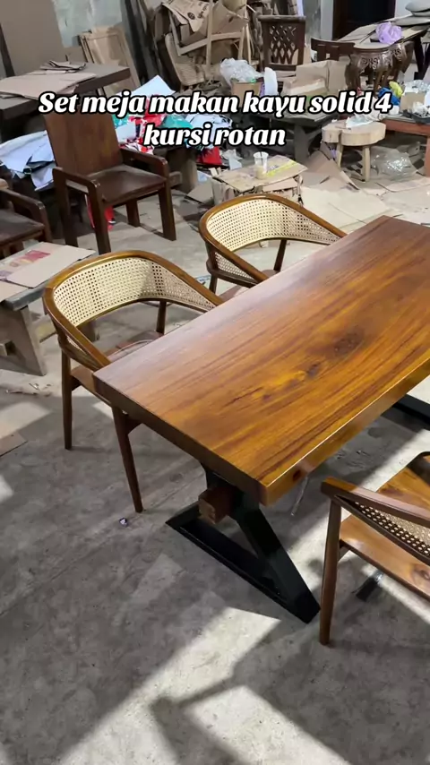 Set meja makan 4 kursi model rotan dengan kaki besi model silang #mejatrembesi #mejakayusolid