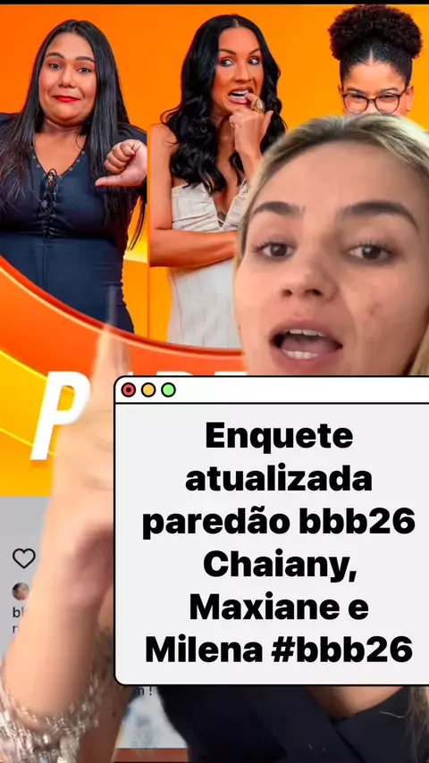Enquete atualizada paredão bbb26 Chaiany, Maxiane e Milena