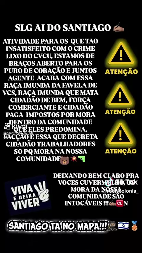aí governador pode tentar pôr aqui no complexo de Israel no dendê pode tentar irmão vai morrer mais polícia do que b****** você está pensando que vai ser igual complexo do alemão que vocês matou aqueles c**** lá fácil aqui vocês vão ver que é o creme irmão aqui a tropa de Israel vai vai morrer mais polícia do que b****** aqui irmão pode botar governador se vem pelo alto vai cair helicóptero pelo alto e pelo baixo irmão 🇮🇱🇮🇱🇦🇷