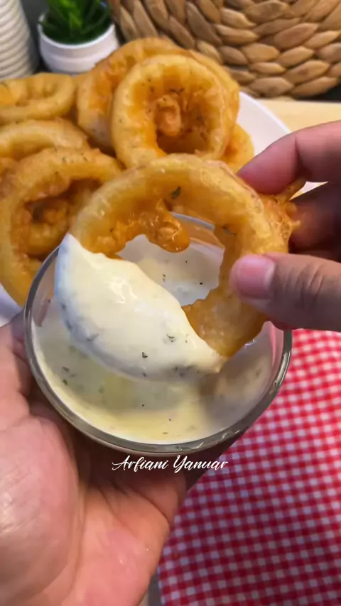 ✨Onion Ring✨ Bahan-bahan: Bawang bombay 1 buah (200gr) Tepung terigu 150 gr Maizena 30 gr Baking powder 1/4 sdt Garam 1/2 sdt Kaldu jamur 1/2 sdt Paprika bubuk 1 sdt Bawang putih bubuk 1 sdt Lada bubuk 1/4 sdt Air soda 230 ml #onionring #onion #bawangbombay #cemilan #cemilansimple