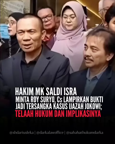 Permintaan Hakim MK Saldi Isra kepada Roy Suryo, Cs untuk melampirkan bukti penetapan Tersangka dalam kasus ijazah Jokowi bukan hanya soal formalitas, melainkan cerminan dari prinsip keadilan dan kepastian hukum yang harus ditegakkan dalam sistem peradilan Indonesia. Sebagai Advokat, saya menekankan pentingnya pemahaman masyarakat terhadap proses hukum yang benar agar tidak mudah terjebak dalam informasi yang tidak berdasar dan menjaga integritas hukum nasional. Salam Keadilan, Adv. Darius Leka...