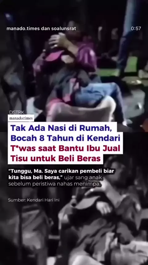 video ini Sensitiv ⚠️⚠️⚠️ Tragedi memilukan terjadi di Kendari, Sulawesi Tenggara. Seorang bocah perempuan berinisial NS (8) meregang nyawa setelah tert*br*k alat berat saat berjualan tisu. Aktivitas itu terpaksa ia lakukan karena di rumahnya tak tersedia makanan. Kisah ini menyisakan duka mendalam sekaligus potret pahit kemiskinan yang masih nyata. Usai kejadian, suasana pilu terekam saat sang ibu menangis histeris memeluk j*s*d anaknya. Dengan suara bergetar, ia mengungkapkan bahwa NS memili...