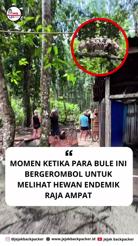 Sebuah video menunjukkan segerombolan wisatawan asing yang berkumpul untuk melihat seekor hewan dengan jelas. Hewan itu terlihat berjalan santai di atas pohon tanpa ada rasa takut. Belakangan diketahui hewan tersebut adalah Kuskus Waigeo, spesies marsupial yang merupakan penghuni asli Pulau Waigeo, Papua. đŸŽ„/ IG @stef_raja4#kuskuswaigeo#papua#jejakbackpacker#