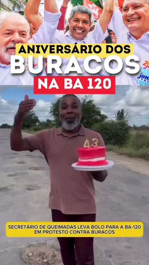 🚨 ESCÂNDALO NA BA-120: 43 ANOS DE ABANDONO! O vereador licenciado e Secretário de Desenvolvimento Econômico de Queimadas, Clemente Filho, fez um protesto irônico às margens da BA-120, levando um bolo para "comemorar" os 43 anos de descaso com a rodovia! 🎂 A via, que liga Queimadas a Monte Santo via Cansanção, está em condições deploráveis, com asfalto destruído. O vídeo do protesto viralizou, expondo a ineficiência do governo Jerônimo Rodrigues (PT) na Bahia! 😡