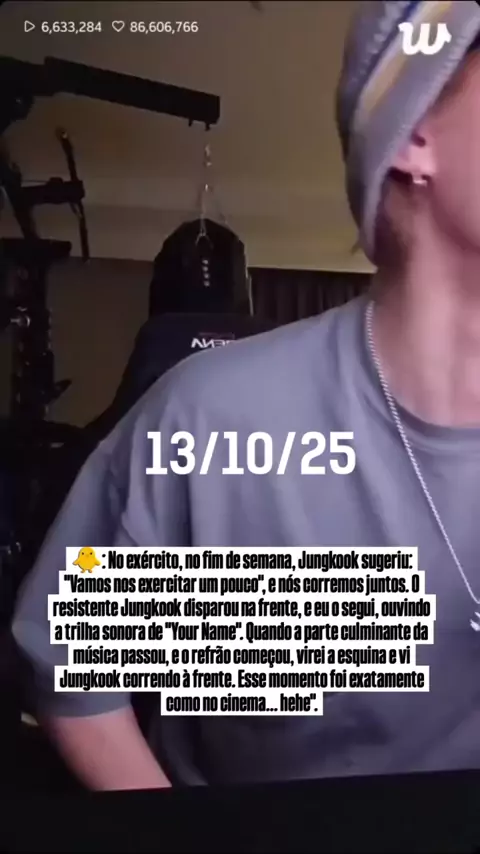 🐥: No exército, no fim de semana, Jungkook sugeriu: "Vamos nos exercitar um pouco", e nós corremos juntos. O resistente Jungkook disparou na frente, e eu o segui, ouvindo a trilha sonora de "Your Name"Sparkle do Radwimps. Quando a parte culminante da música passou, e o refrão começou, virei a esquina e vi Jungkook correndo à frente. Esse momento foi exatamente como no cinema... hehe". PARA QUEM NÃO SABE YOUR NAME É UM ANIME PREFERIDO DO JUNGKOOK E DO JIMIN QUE FALA SOBRE AMOR E FIO VERMELHO