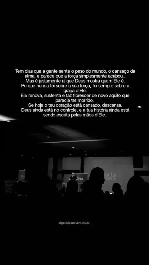 Tem dias em que o peso da vida tenta nos fazer parar… o cansaço da alma parece falar mais alto, e o coração só quer descansar. Mas é nesses momentos que Deus se revela de forma mais linda. Quando nossas forças acabam, é aí que a graça d’Ele começa a agir. Ele pega os pedaços que a dor deixou e transforma em algo novo, porque o que parecia ter morrido, Ele faz florescer novamente. . Então, se hoje você sente que não aguenta mais, apenas descanse em Deus. Ele ainda está no controle. Nada foge d