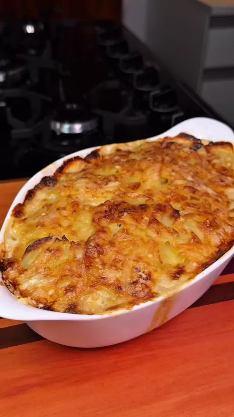 Esse acompanhamento é um clássico e é muito fácil: gratin (gratinado) Vamos aos ingredientes? 4 batatas médias descascadas e fatiadas finamente 1L de leite integral 1 colher de chá de Alecrim seco (mas de preferência fresco) 1 colher de chá de orégano 1 colher de café de noz moscada ralada na hora 1 colher de chá de pimenta do reino 1 colher de chá de alho em pó 1 colher de sopa de sal 150g de queijo gruyere ou emmental 1 colher de sopa de manteiga Modo de preparo: Descasque as batatas e f