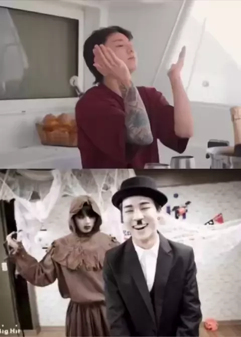 🐰: smears sunscreen all over his face 😂… 🐰: “how do I look, Mr. Jimin?”… 🐥: 😂… 🐥: “who are you” 😂… 🐥: “are you Charlie Chaplin” 😂… 🐰: 😁 happy JK… Charlie Chaplin 👀….. #jikook #jimin #jungkook