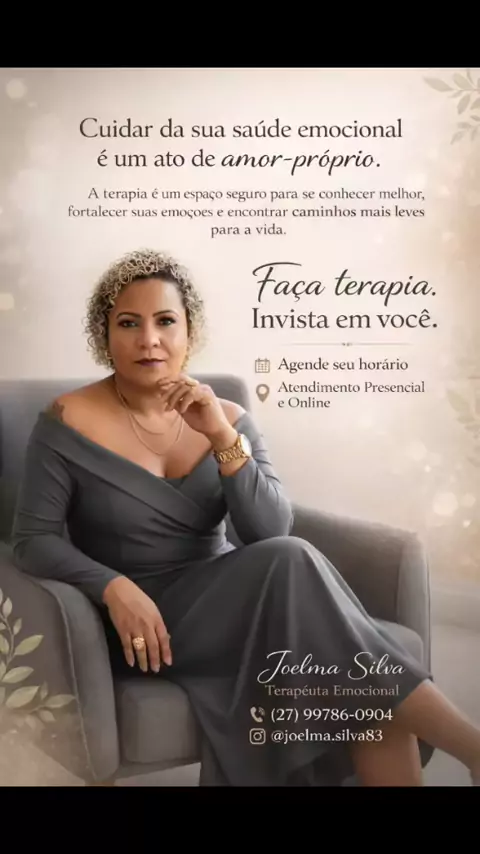 : Cuidar da sua saúde emocional é um ato de amor-próprio. A terapia é um espaço seguro para você se ouvir, se fortalecer e viver com mais leveza. Se você sente que está sobrecarregada, ansiosa ou precisando de acolhimento, a terapia pode te ajudar. Faça terapia. Invista em você. 晋 Agende seu horário pelo WhatsApp Atendimento Online para todo o Brasil Atendimento Presencial em Serra -ES Clique em Falar no WhatsApp Joelma Silva I Terapêuta Emocional (27)99786-0904