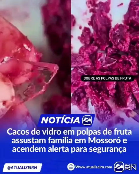 GENTE!😳🚨Uma moradora de Mossoró (RN), vice-presidente da OAB, encontrou cacos de vidro em polpas de uva da marca Sterbom compradas no supermercado Assaí. O caso veio à tona após sua filha levar um suco para a escola e a professora identificar o vidro no copo. Outros pacotes do mesmo lote também apresentaram fragmentos. A mãe irá acionar o Procon e a Vigilância Sanitária. Até o momento, a empresa e o supermercado não se pronunciaram. O caso representa risco grave à saúde pública. Vídeo: @furo...