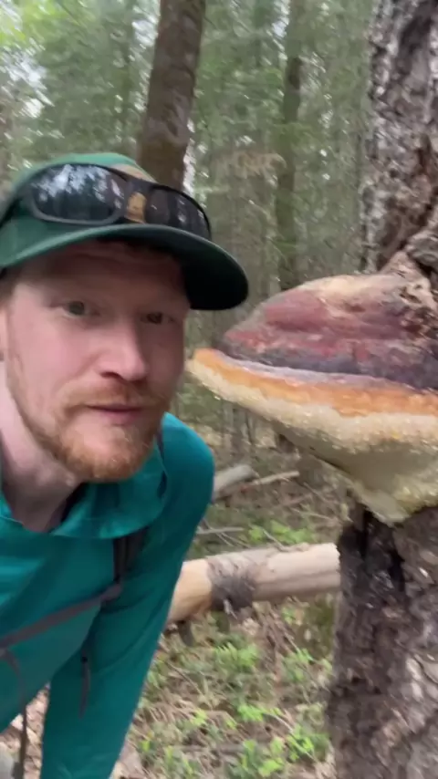 Lambendo a grande e dura concha molhada para a ciência! Este é o Red Belted Conk pinicola Species Complex), é um cogumelo poliporo de podridão marrom que é um decompositor comum encontrado em árvores de coníferas. As gotículas ou umidade neste cogumelo são conhecidas como gutação, que é essencialmente suor de cogumelo, gerado pelo corpo de frutificação de rápido crescimento. Não está claro se a gutação serve a um propósito, mas pode ajudar a dissuadir insetos e lesmas de petiscar nas bordas ten...