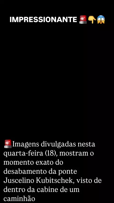 Estrutura que desabou - Imagens divulgadas nesta quarta-feira (18), pela advogada Mellissa Fachinello, mostram o momento exato do desabamento da ponte Juscelino Kubitschek, visto de dentro da cabine de um caminhão. A estrutura, que ligava Tocantins ao Maranhão pela TO-226, desabou no dia 22 de dezembro de 2024. Uma nova ponte foi inaugurada em dezembro de 2025, um ano após a tragédia. As imagens foram registradas pela câmera de monitoramento de um caminhão da transportadora Expresso Geração,...