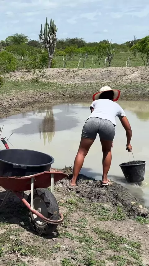 Carregado água do tanque de barro para galinhas