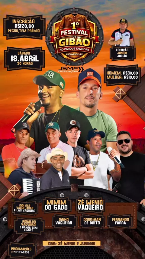📢 Se prepare! Vem aí o 1º Festival de Gibão! 🤠🔥 🗓️ Data: 18 de abril de 2026 🎉 Um grande evento que promete reunir cultura, tradição e muita animação! 👥 Organização: Zé Wenio e Juninho do Rocha 📣 Divulgação: JSMF Divulgações 🤝 Apoio: LN Bebidas 📍 Rua Juraci Bezerra dos Anjos, nº 516 📞 Contato: (87) 98134-5803 📣 Divulgação: JSMF Divulgações 🔖 #arcoverde #jsmfarcoverde #jsmfsebastiaocosta #kwai #danças
