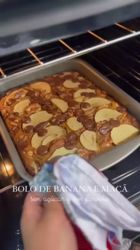 Bolo de banana e maça sem glúten e lactose: 3 bananas (usei nanica madura)-3 ovos-1/2 de x de óleo 1 x de uva passa-2 x de avela-1 c de sopa de fermento-1/2 maçă grande (ou 1 pequena)-90g de chocolate (70% cacau)-50g de castanhas (usei de nozes)-1/2 maça fatiada > Bata os ovos, o óleo, as bananas, a maça e a uva passa. Junte a aveia e bata mais. Junte o fermento e bata o mínimo possível, só p/ misturar. Coloque a maça, as gotinhas de choco e castanhas sobre o bolo. Leve ao forno #kwaicomida