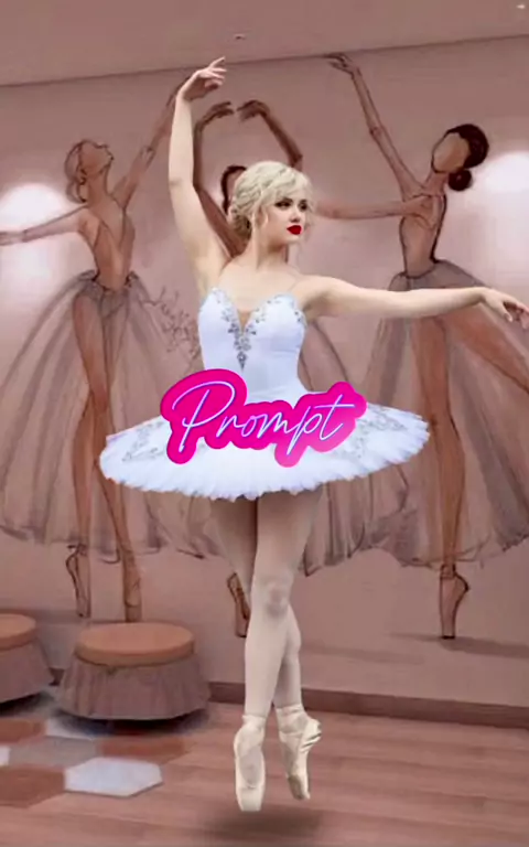 Ultra-realistic 4K high-resolution full-body portrait of a graceful ballerina wearing a classic white tutu with silver decorative trim, standing en pointe with one leg straight and the other slightly relaxed, arms raised in an elegant ballet pose (one arm lifted gracefully upward, the other extended sideways), slender and poised posture, serene and confident facial expression, face and hairstyle replaced with the person from [UPLOAD_REFERENCE_PHOTO], preserving all natural facial features and ha