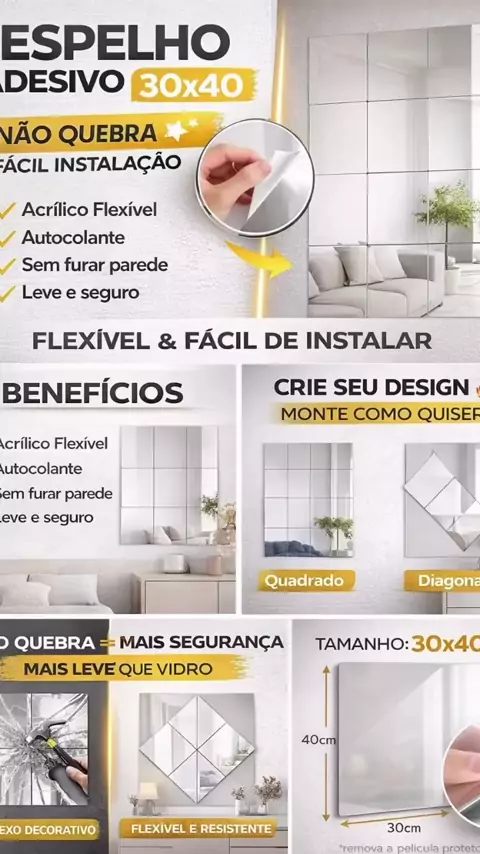 ESPelho Wolfalpha Adesivo Acrílico 30x40cm Flexível Autocolante | Decorativo Parede Sala Quarto Banheiro Fácil Instalação seu estilo visual #casa #espelho #decoraçao