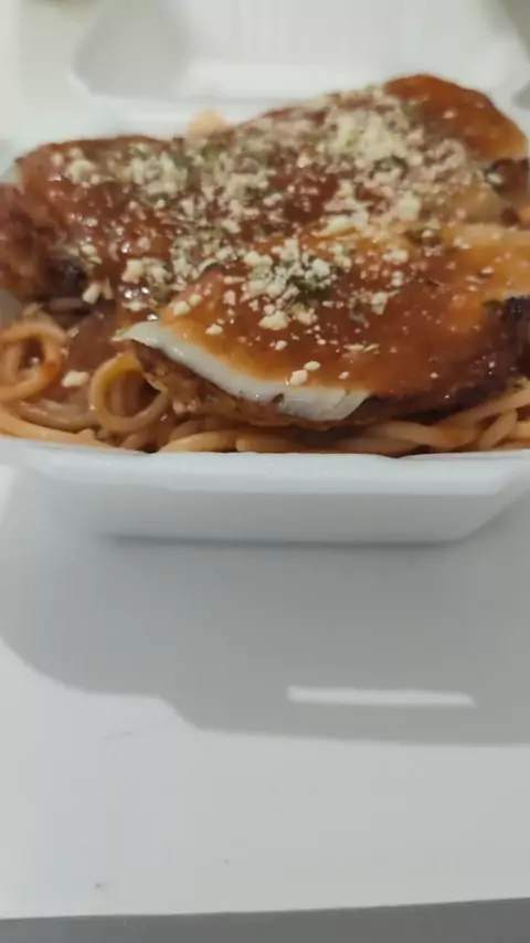 Parmegiana de frango 😍 250g de macarrão espaguete 300ml de molho de tomate com cebola, alho e coentro (a gosto). 250g de filé de frango empanado Queijo mussarela e orégano. #comidacaseira #almoço #primemassas #parmegianadefrango