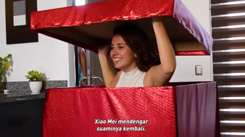 Orang perempuan bersembunyi di kotak hadiah dan melihat adegan patah hati.