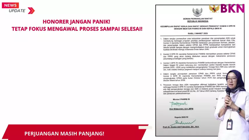 KAWAL SAMPAI TUNTAS! HONORER JANGAN PANIK! TETAP FOKUS MENGAWAL PRROSES SAMPAI SELESAI! Pemerintah Daerah harus menyelesaikan tenaga honorer sampai tahun 2026 PPPK Tahap 1 diupayakan sesuai jadwal dan sesuai kemapuan daerah. PPPK Tahap 2 diupayakan sesuai jadwal dan sesuai kemapuan daerah. Optimalisasi : - R2/R3 - Mengisi formsi jabatan yang masih tersedia – PPPK Penuh Waktu. - Tidak mendapatkan formasi jabatan – PPPK Paruh Waktu. TMS Tahap 1 dan 2 Non Data Base BKN - Tetap dipekerjakan jika...