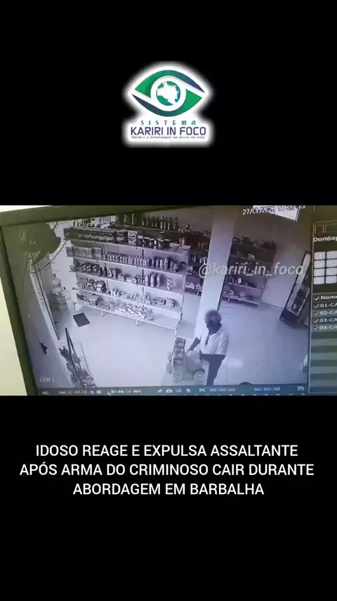 BARBALHA – Uma tentativa de assalto no bairro Alto da Alegria terminou de forma inesperada na manhã desta terça-feira (27). Câmeras de monitoramento de um estabelecimento comercial flagraram o momento em que um idoso reagiu à abordagem de um criminoso e conseguiu expulsá-lo do local. As imagens mostram o senhor organizando mercadorias quando um homem de capacete e mochila entra no recinto de forma agressiva. Durante o anúncio do assalto, o suspeito se atrapalha e deixa a arma cair no chão, pró...