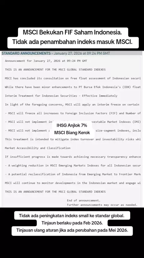 INI ADALAH PENGUMUMAN UNTUK INDEKS STANDAR GLOBAL MSCI MSCI telah menyelesaikan konsultasinya mengenai penilaian free float sekuritas Indonesia. Meskipun beberapa pelaku global mendukung penggunaan Laporan Komposisi Kepemilikan Bulanan PT Kustodian Sentral Efek Indonesia (KSEI) sebagai data referensi tambahan, banyak investor menyatakan kekhawatiran yang signifikan tentang ketergantungan pada kategorisasi pemegang saham KSEI. Meskipun telah ada peningkatan kecil pada data float PT Bursa Efek In...
