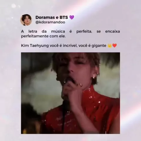 “V é frequentemente destacado por seus visuais excepcionais, sendo frequentemente listado em vários rankings de “mais bonito do mundo”. Sua voz profunda e comovente adicionam colorido único as músicas do BTS, fazendo-o se destacar no grupo. Além disso, seu senso de moda é amplamente admirado, sendo frequentemente visto como um criador de tendências tanto na indústria de K-pop quanto no cenário da moda global. Esse rapaz de 28 anos tem inúmeros recordes e conquistou uma enorme base de fans"
