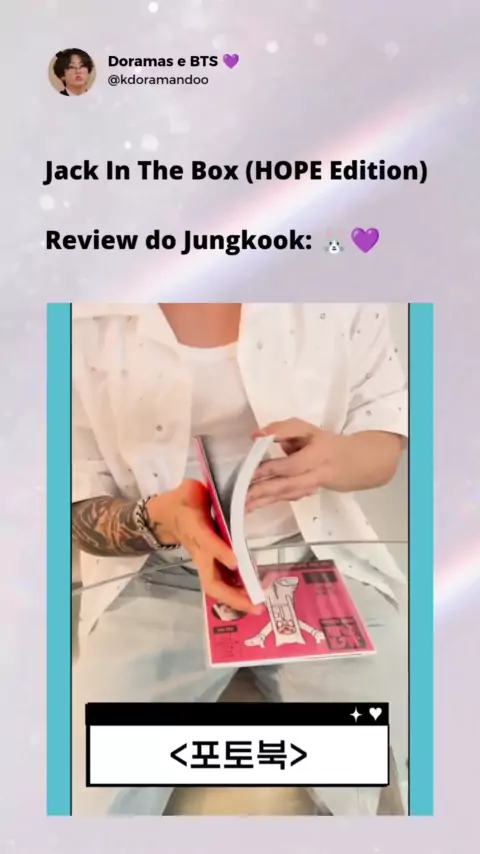 🐰Olá, aqui é o Jungkook! "Jack In The Box HOPE Edition" foi lançado, então vou fazer o unboxing! 🐰 Hope Edition! 🐰 Essas são as fotos *vê o Photo Book* 🐰 Vamos ver as fotos primeiro. São fotos novas, certo? Sim, elas são novas. 🐰 Ah, j-hope! Sim, j-hope! 🐰 Sim, j-hope! Parece que hobi hyung prefere o lado esquerdo do rosto. Ele gosta do lado esquerdo do rosto dele 🐰 É como... Seu rosto fica... fica assim *demonstra* 🐰 Essa foi minha review sobre "Jack In The Box HOPE Edition" de j-hope!
