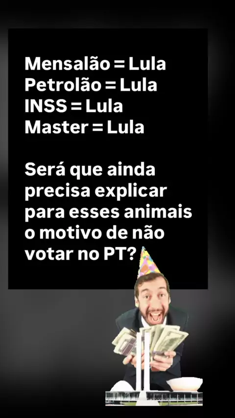 Mensalão = Lula Petrolão = Lula INSS = Lula Master = Lula Será que ainda precisa explicar para esses animais o motivo de não votar no PT?