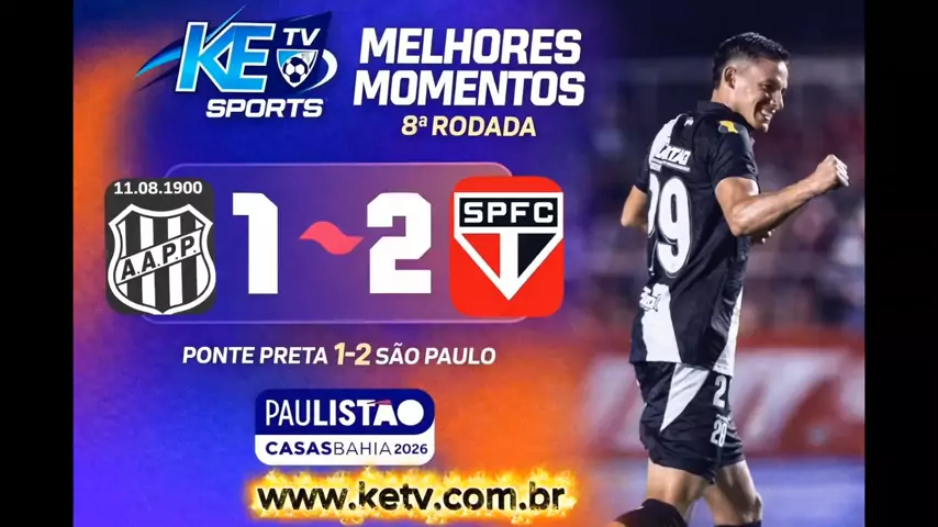 Campeonato Paulista 8ªRodada Ponte Preta 1x2 São Paulo Melhores Momentos KE TV Sports e convidamos você 🫵 para acessar o nosso site e veja tudo sobre os Campeonatos Estaduais e Brasileirão jogos tabela transmissões streaming e muito mais acesse já www.ketv.com.br #ketvsports #brasileirao2026 #futebolbrasileiro #pontepreta #saopaulo