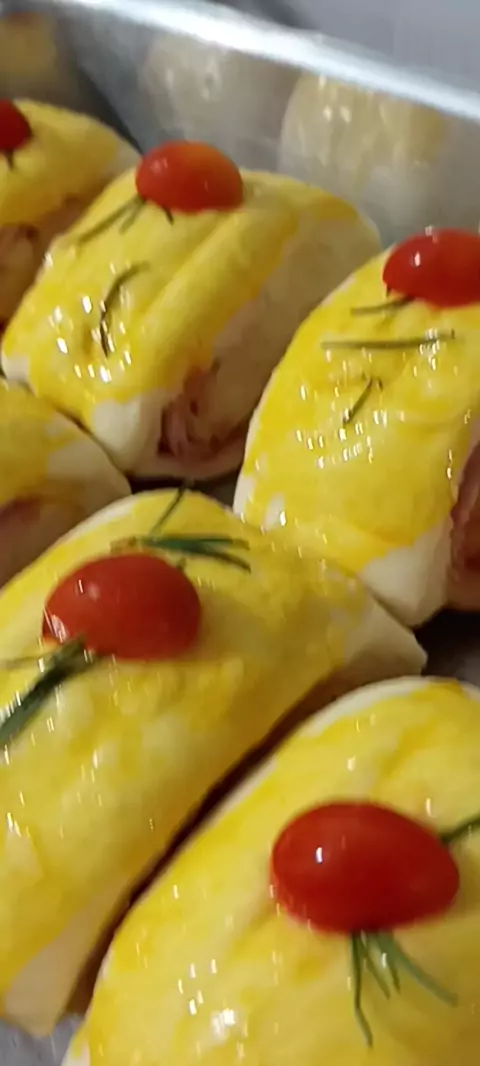 Salgado delicioso assado Ingredientes 2 colheres de sopa de fermento biológico seco 3 colheres de sopa de açúcar 2 colheres de margarina 1/2 colher de sopa de sal 500ml de água morna 1 kg de farinha de trigo gema para pincelar Recheio: 400g de peru/frango defumado ou presunto 400g de queijo mussarela ralado 100g de maionese Molho de tomate ou ketchup a gosto Modo de Preparo Misture o fermento, açúcar, água morna,  margarina, sal e farinha de trigo até formar uma massa homogênea e