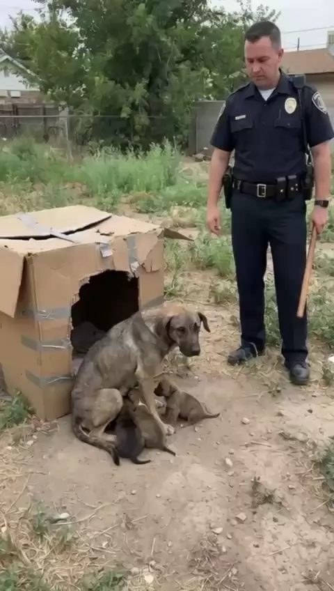 What Looked Like Cruelty Turned Into an Act of Kindness At first glance, it looks like something terrible. A police officer appears to be destroying a fragile cardboard shelter where a mother dog and her puppies are living. The scene feels cruel, and hearts sink. But moments later, the truth is revealed. The officer returns carrying a beautiful, well-built wooden doghouse strong, warm, and safe for the dog family. The old cardboard shelter was removed only to make space for something better. Wha