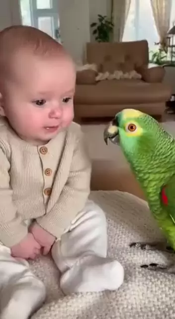 é a coisa mais linda… que coisa mais linda! O papagaio conversando com a criança e o bebê 🥹💖 E o bebê falando ‘papai’, com o papagaio ensinando ele a falar ‘papai’… é a coisa mais linda do mundo. Cena que enche o coração de amor e faz a gente sorrir sem perceber