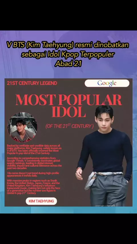 Didukung oleh data yg dpt diverifikasi & kredibel di semua platform utama, Kim Taehyung yg dikenal luas sebagai V dari BTS telah resmi dinobatkan sebagai Idol K-pop Paling Populer di Abad ke-21. Menurut statistik komprehensif dari Google Trends, #V secara konsisten mendominasi peringkat pencarian global, memimpin dalam minat digital, visibilitas, dampak, dan relevansi budaya selama dua dekade terakhir. Dengan puncak popularitas yang luar biasa di beberapa kawasan seperti Korea Selatan, Amerika #