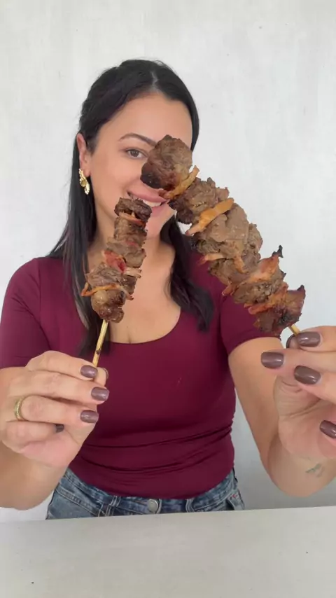 Quem já comeu essa carne? Espetinho de bananinha bovina! Essa carne é barata e uma delícia! #churrasco #espetinho #carne #receitas #receita
