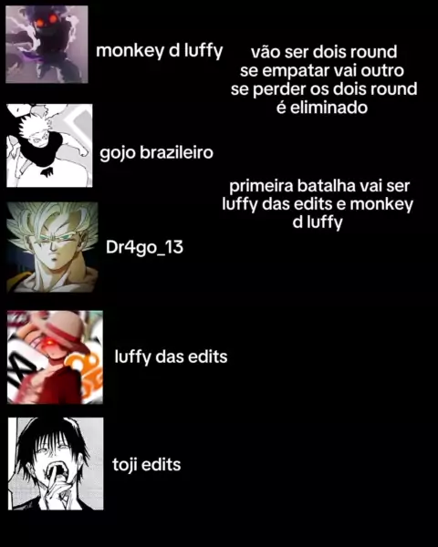 @Gojo Brazileiro🐐🇧🇷(O150001289725690) @⚡ Luffy das edits ⚡(O150000170004900) @𓆩☠︎︎𓆪⋆𓊝Mønꝁɇɏ Đ Łᵾffɏ王🍖⋆𓆩☠︎︎𓆪(O150000209560131) @Dr4go_13(O150001450134626)