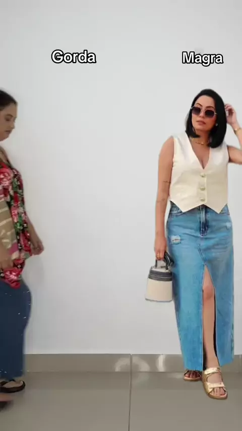 Look plus size estiloso com saia com saia mid jeans e colete #roupasfemininas #looks #lookolussize #lookdesaia #plussize
