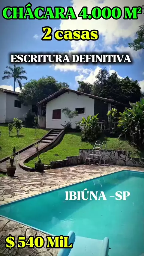 🌳 *Atenção, amantes da natureza e do sossego!* 🌳 Você já imaginou ter um pedaço do paraíso a apenas 65 km de São Paulo? Venha conhecer essa incrível chácara de 4.000 metros quadrados, localizada na encantadora Estância Turística de Ibiúna! valor 540 mil 🏡 *São duas casas* para você e sua família aproveitarem cada momento juntos. A casa principal conta com 3 dormitórios, sendo 2 suítes, garantindo conforto e privacidade para todos! 🍽️ E que tal receber amigos e familiares em uma área