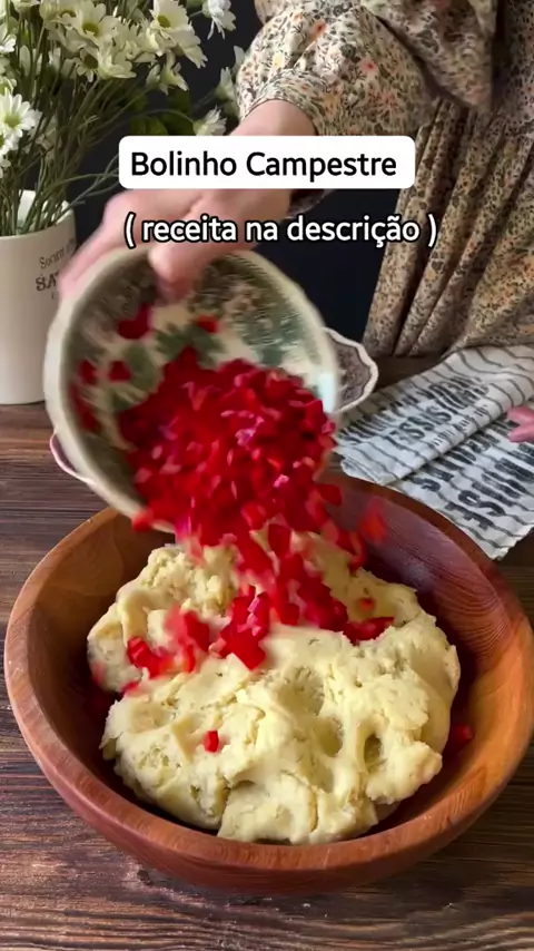 #BoraCozinhar♥️ #Liége🦋Bolinho Campestre uma delícia #food #bolinho #receitassaborosas 650g de farinha 250g de manteiga 100ml de óleo 150g de iogurte 2 ovos ( reserve a gema de um para pincelar ) 15g de sal 30g de açúcar 20g de fermento em pó 2 pimentões vermelhos meia xícara de azeitonas salsa picada Misture todos os ingredientes, exceto a salsa, azeitonas e pimentões. Em seguida adicione o que reservou e misture bem a massa até ficar macia. Faça bolinhas e depois achate coloque