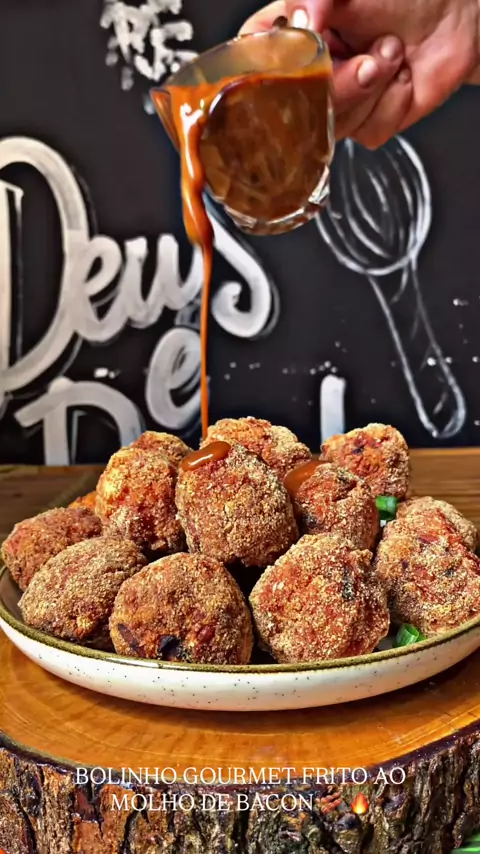 Bolinho gourmet frito, com calda de bacon defumado🤤