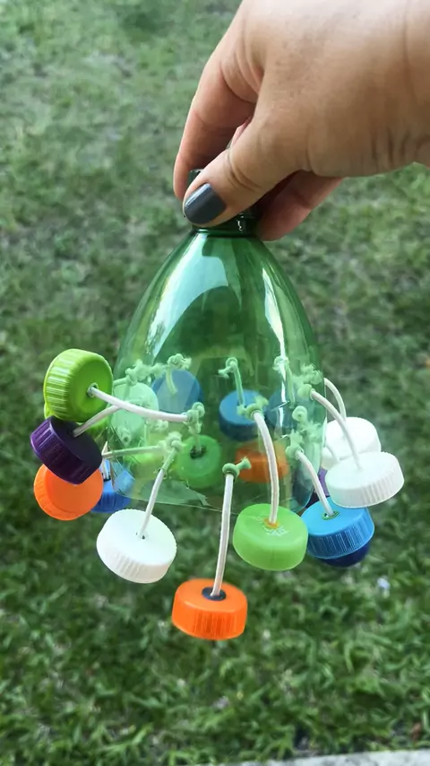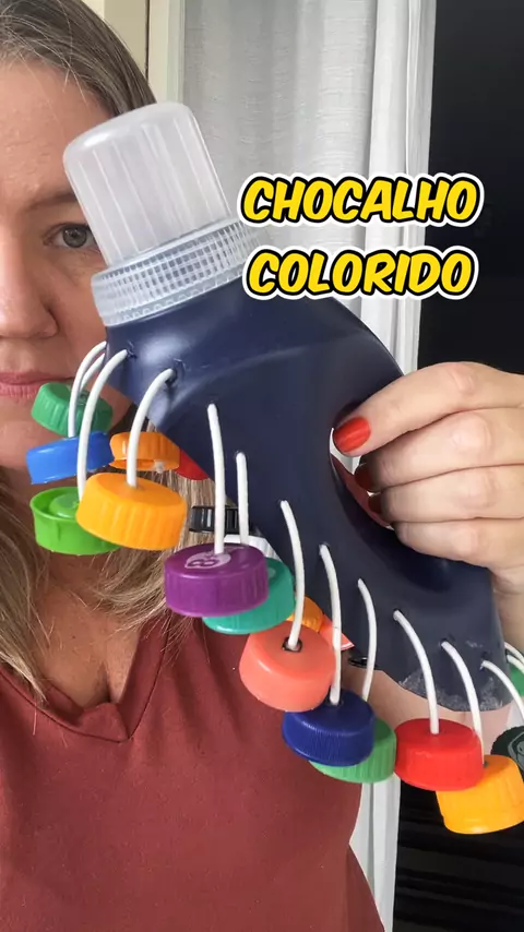 Um chocalho construído com tampinhas de garrafa PET, elástico e garrafa PET cortada. Para fazer os furos, uso ferro de solda. Os elásticos são cortados com aproximadamente 13 cm. Simples de montar, seguro quando bem finalizado e perfeito para explorar pulsação, coordenação e intensidade sonora com as crianças. ♻️🎶 #musicalizacao #educacaomusical #profedemusica #reciclagem #instrumentomusical