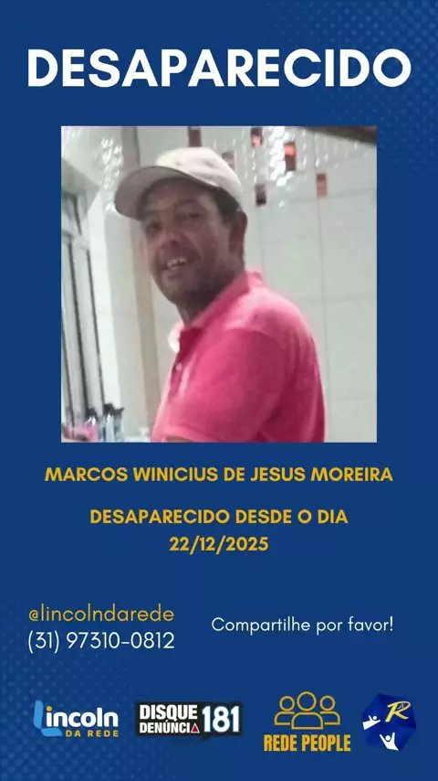 🚨 DESAPARECIDO 🚨 Procura-se Marcos Vinicius, que está desaparecido. Familiares e amigos estão muito preocupados e pedem a ajuda de todos. Se você tiver qualquer informação, por favor entre em contato: 📞 (31) 98584-0682 Compartilhe para que essa informação chegue ao maior número de pessoas possível. 🙏 Qualquer ajuda é importante!
