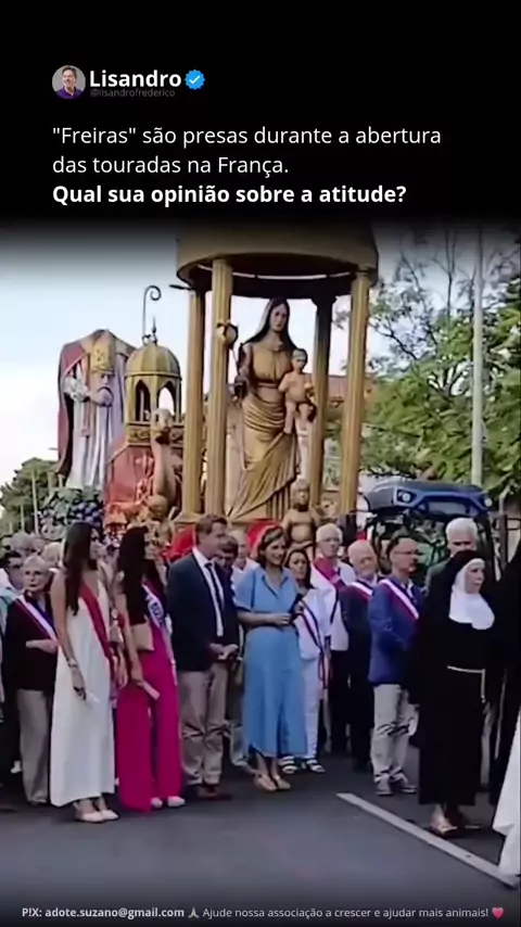 ⚠️ Entenda: Durante a procissão religiosa que abre a Feria de Béziers, no sul da França, duas ativistas da PETA — vestidas de freiras — interromperam o cortejo exibindo um cartaz com a imagem da Virgem Maria ao lado de um touro agonizando. O protesto denunciava a ligação entre Igreja e as touradas, que são legalizadas em algumas regiões francesas. Na tradição local as procissões dão início a temporada das touradas na cidade. No vídeo é possível ver o prefeito Robert Ménard reagindo e empurra...