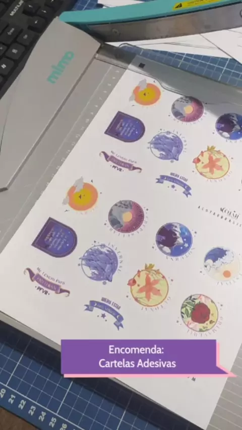 Uma encomenda de 50 cartelas de adesivos para brinde em um evento que ocorreu em SP. Máquinas usadas: Papel glossy brilho adesivo, impressora Canon G6010, plotter de recorte Curió 1, guilhotina da marca Mimo, canteadeira conjulgada da Lassane para arredondar os cantos. #adesivos #brinde #acotar #encomenda