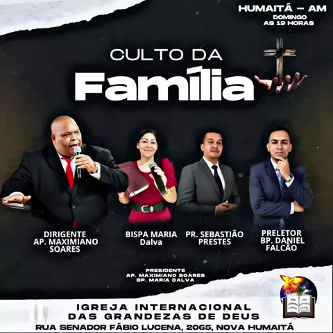 É HOJE o DOMINGÃO DA FAMÍLIA! Às 19 HORAS, esperamos VOCÊ E SUA FAMÍLIA para um CULTO ESPECIAL, preparado por DEUS. LOCAL: Igreja Internacional das Grandezas de Deus, BAIRRO NOVO HUMAITÁ, RUA SENADOR FÁBIO LUCENA, Nº 2065. DIRIGENTE: Bispo Daniel Falcão. PRELETOR: Pr. Maximiano Soares. APOIO: Equipe Fé. REALIZAÇÃO: Igreja Internacional das Grandezas de Deus. DIREÇÃO GERAL: Pr. Maximiano Soares e BISPA MARIA DALVA. VENHA, TRAGA SUA FAMÍLIA. AQUI É UM LUGAR PARA VOCÊ PERTENCER.