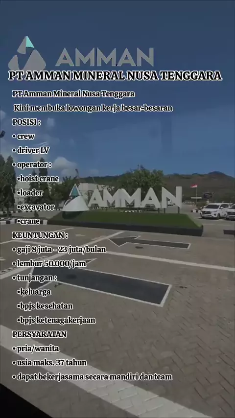 PT Amman Mineral Nusa Tenggara Kini membuka lowongan kerja besar-besaran POSISI : • crew • driver LV • operator : •hoist crane •loader •excavator •crane KEUNTUNGAN : • gaji 8 juta - 23 juta/bulan • lembur 50.000/jam • tunjangan : •keluarga •bpjs kesehatan •bpjs ketenagakerjaan PERSYARATAN • pria/wanita • usia maks. 37 tahun • dapat bekerjasama secara mandiri dan team #Sumbawa #amman #NTB #LokerNtb